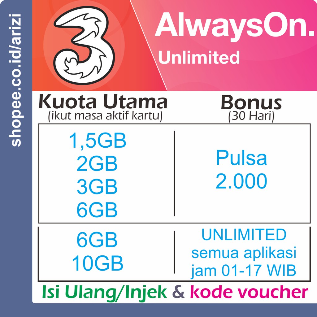 Kartu tri terkenal dengan produk always on mereka yang. Itu artinya, sisa jam sesudahnya memanfaatkan kuota always on. Internet always on, paket itu akan terus aktif selama kartu anda aktif. Kuota ++ mengikuti masa aktif kartu · kuota bebas nelpon sesama tri 180 hari · kartu perdana always on 360 hari ( 1 tahun masa aktif ). Internet always on, paket itu akan terus aktif selama kartu anda aktif.