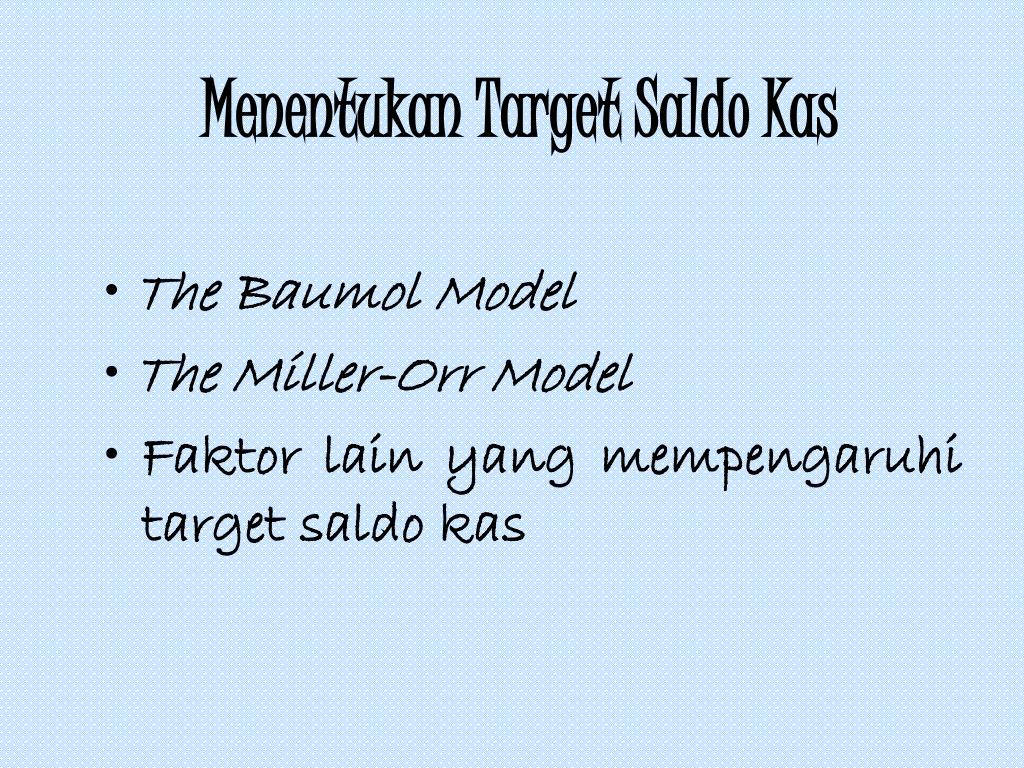 Total cost of holding cash. Faktor lain yang mempengaruhi target saldo kas. Kebutuhan kas perusahaan selama satu bulan rp. Model persediaan untuk kas (model baumol). Model mengklarifikasi isu mengenai manajemen kas:.